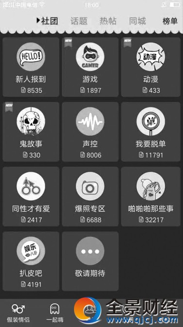 6日晚,记者下载“假装情侣”APP时发现,整个APP分为社团、话题、热帖、同城等几大版块。其中,在社团的“啪啪啪那些事”、“爆照专区”中,有用户将较为暴露的自拍照片进行上传,并配着充满性挑逗的语言。