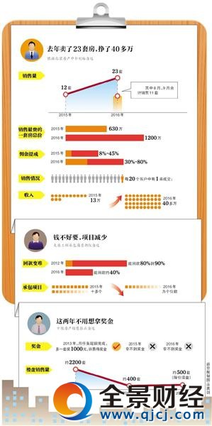 2015年,多项对楼市利好的政策出台,包括贷款首付比例降低,多地放宽公积金的使用限制等。但刘裕觉得,2016年北京的楼市更火:2016年他总共卖了23套房,获得了40多万的业绩提成,而2015年总共卖了12套,收入为13万。