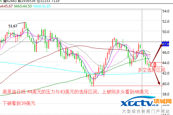 44美元以及43美元极为关键,若44美元上方破位的话市场日线将形成一个双底的W底部,加之一系列的恐慌性投机行为很有可能导致沥青一波快速而猛烈的暴涨,暴涨目标看48美元,而日内只要下方破了43美元则将彻底破掉K线图走势以及多头投机心理,所以说与其说今天的行情走势是市场行为不如说今天行情是投机心态行为,看的就是多空头被击溃。