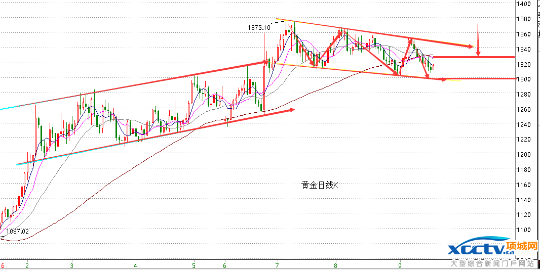 贵金属周线K显示,自前期触及高位1375后,金价处于震荡下行的弱势下跌格局中,直接导致均线从全多头排列转换为短期短期均线MA5、MA10死叉,短期受支撑与周线MA22均线,加价短期内震荡盘整与1320--1310区间。