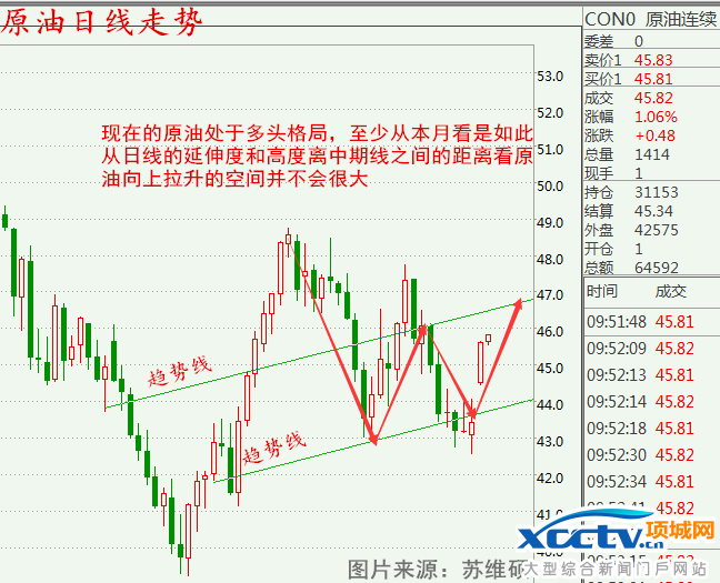 沥青:大宗商品中的沥青本周改变了之前的颓势反而维持强势,月线阳线必可避免,现在的沥青处于多头格局,至少从本月看是如此,从日线的延伸度和高度离中期线之间的距离看,沥青向上拉升的空间并不会很大,包括未来涨到51美元甚至更高点位,其实都无法改变一个重要的事实,沥青现在处在月线关键空头点位区域,这个区域高度具有一定的不确定,在46-50之间的任何一个位置,现在已经达到了,这也是我不太沥青追多的原因,我依然维持低多的思路,等下个月可能的新高,之后冲高回落,走出一波修正行情,本月OPEC即将召开会议,市场对本次会议现在不给予什么太多的希望减产,沥青在需求端改善的情况下,过去价格低迷形成的产量下滑逐步发挥了效益,价格已经涨到了46美元,我看也没有必要再这个时间内减产,那是自己砸自己的脚的行为,但是这些国家的表态至关重要,不管怎么说,沥青借助本次会议出现冲高回落修正,并为未来再次抄底带来了机遇,希望大家能够把握好时机。更多精彩内容可关注公众号“苏维硕财经专刊”获取实时分析