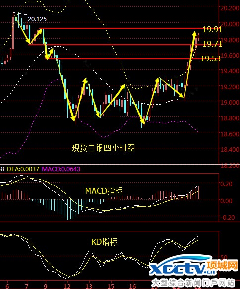 粤微盘从四小时走势图来看,K线同样突破上轨运行至布林带上轨上方,布林带通道开口,上轨接近垂直状态,短线支撑看向19.71~19.60区间。附图MACD指标快慢线持续向上运行,红色动能柱充分放量;KD指标向上运行。综合来看,粤微盘目前整体趋势形成上涨趋势,粤微盘站稳5日均线强势上扬,日线图大阳收高,重新收复此前下跌失地,使得周线收复10周线,趋势重新回归高位震荡,而日线图的多次下探回升,也表现出短期抗跌,响哥建议日内粤微盘操作方面保持回落做多为主,反弹做空为辅思路操作。介于昨日大阳。今日还会延续,短线操作先惯性看多。