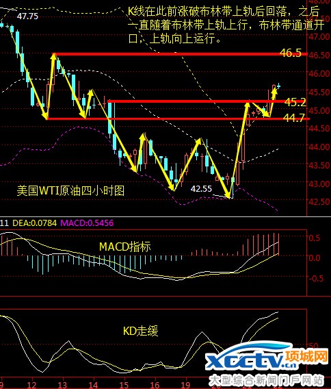 沥青从四小时走势图来看,K线在此前涨破布林带上轨后回落,之后再次反弹随着布林带上轨持续上行,目前K线运行在布林带上轨上方,短期内上方存在46这个整数关口的压力。从指标来看,布林带通道开口,上轨向上运行,MACD指标快慢线持续向上发散运行,红色动能柱充分放量;白度查找“响哥论金”可查看以往更多策略。KD指标持续向上,但有所走缓,并且KD值已大于80进入超买区间。综合来段,短期内油价上涨动能依然充足,操作上建议逢低买入多单为主。但在技术面有三个原因可能导致油价回落:1.K线已涨破上轨有修复行情需求;2.隔夜油价大涨多头有获利离场可能;3.KD进入超买。响哥建议操作上以回踩做多为主。
