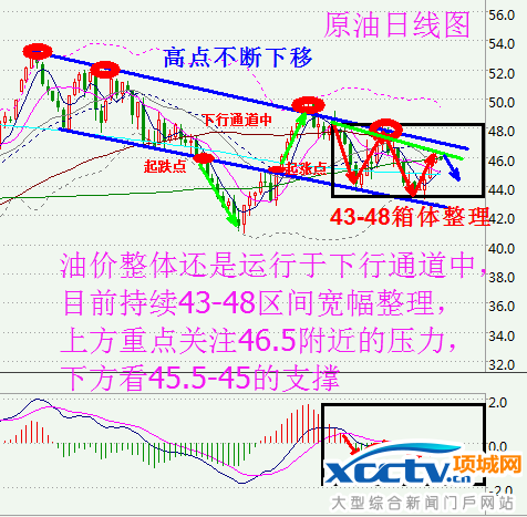 技术面上分析来看,沥青日线图上录得三连涨,不过昨天日线收取一根带有上影线的小阳线,说明上方压力比较强,油价面临回落风险,加之昨晚多次上冲46.5无果,所以在46附近位置不建议盲目去追多,关注了蒋妍琋贵金属投资联盟公众号的朋友都知道,周三晚间推送了一篇EIA布局思路的文章,也有强调46.5附近可以布局一次空单,如果意外见47及以上,都可小仓位逐渐加仓空,止损统一放在49位置,小中长线目标依然看至43附近,这里既然提到是小中长线,那么策略的有效时间肯定要比短线策略长,其中这同时也是思路和趋势,投资最主要的就是顺势而为,而在我们平时的操作过程中,也要注重趋势,而不是仅仅为了短线操作而操作,只是去盯着每天的一个策略,这也是大部分投资者的一个通病,这是在平时操作中也需要注意的,这里也给大家解释一下为什么会给46.5附近及其以上点位布局空单,大家最近也可以看到,此次下跌至43附近的起跌点就是在46.5附近,同时沥青自40关口位置下方获得企稳反弹最高至49位置受阻回落后,虽然中间也都出现过反弹走势,但是高点却在逐渐下移,而对于9月28日OPEC会议磋商冻产的可能性,蒋妍琋也一直强调可能性不大,而且即使达成冻产共识,但是沥青供应过剩的局面不从根本上有效改善,那么油价上涨的空间肯定会受到一定的限制,再回到今天的行情上来,昨日冲击46.5位置失败,4小时图上出现连阴K线,均线上行之势在减缓,而且上涨动能也在缩减,日内油价走低的可能性非常大,所以操作上建议高空为主!