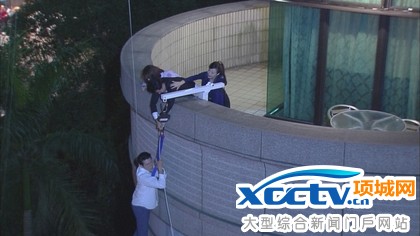 余秉谚(前)挂在4层楼外,相当害怕。民视提供