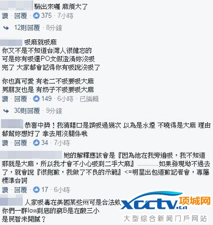 她被警方「打脸」消息曝光后,个人脸书第一po却是悠哉看韩剧《来自星星的你》,笑说「旧片再看一次还是好好看」。而她的官方粉丝页早被网友酸爆,「验出来啰,麻烦大了」;「吸麻就吸麻,你又不是不知道台湾人很健忘的,可是妳有吸还PO文假澄清妳没吸,完了,大家都会记得你有吸说没吸了」;「恭喜中奖!我猜藉口是误吸过几次,以为是水烟,不晓得是大麻,理由都帮妳想好了,拿去用没关係哦」。