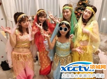 辻希美(左起)、藤本美贵、吉泽瞳、饭田圭织穿印度装参加万圣节派对。翻摄辻希美部落格