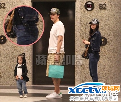 餐毕,一家三口等电梯,侧面看过去林奇葳(右)肚子隆起,状似有喜。特勤组摄