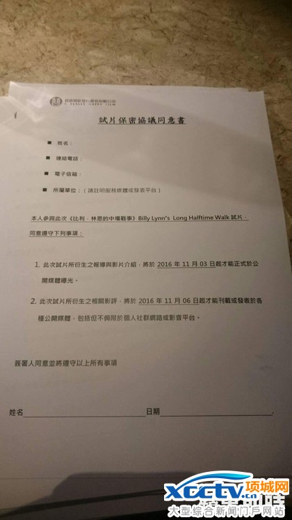 京站威秀放映厅外播送《比利?林恩的中场战事》预告。娱乐中心摄 电影公司要求媒体签下保密协议书。娱乐中心摄 今试映版本是最高规格的每秒120格、4K、3D版本。娱乐中心摄 李安今晚将出席台北首映典礼。资料照片 唐立淇。翻摄唐立淇脸书