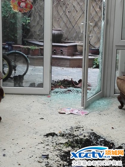 樊馨曼住家大门的玻璃碎了一地,现场一片狼藉。翻摄搜狐娱乐