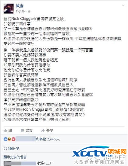 因为自学英文并且录製饶舌影片上传的印尼16岁超级饶舌新星,Rich Chigga前天(2号)在台北的夜店开唱,吸引上百粉丝争相前往。但是在活动结束后却有人在脸书大力的批评。曾经因为殴打歌手林俊杰而上新闻的饶舌歌手陈彦衡,在脸书PO文表示,「台湾饶舌到最后最可悲的是那些观众」「台湾人的习性却是喜欢瞧不起欺负自己人」。他指出台湾本土有许多有才华的饶舌歌手却不被大家重视,连三餐都有问题,但是观众却愿意花一千块去听一个嫩咖唱两三首歌只为了跟风。用字遣词看得出陈彦衡对于台湾饶舌圈的现象非常不满。而网友对于这番言论的评价有正有反,有人大推陈彦衡点破现在台湾跟风现象并且支持台湾饶舌歌手,也有网友认为Rich Chigga从印尼红到国际全部都是靠实力。对于这样的说法,你又是怎幺看的呢?(陈晖/台北报导)