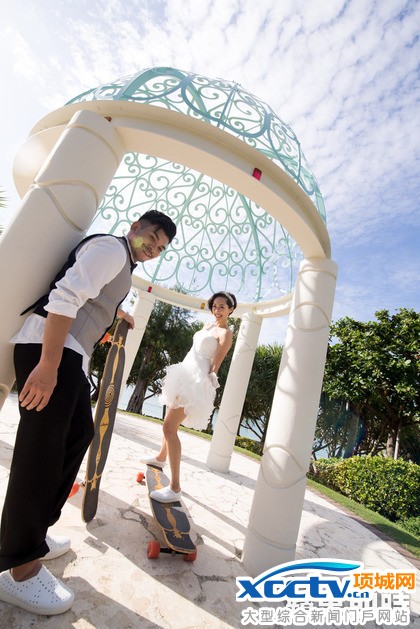 Gigi(右)和老公史丹利之前带着滑板到沖绳拍婚纱照。Gigi提供