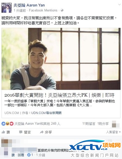 网友按讚:「直接把分猪肉的规则说出来,94狂。」由三立电视主办的华剧大赏,今年迈入第5届,奖项评分基準包括观众网路票选,今天中午开跑。炎亚纶主演的《后菜鸟的灿烂时代》入围,理所当然成为最佳男演员候选人,他却叫粉丝不必投他,「亲爱的大家,我没有要出席所以不会有奖项,请各位不需要帮忙投票,请利用时间好好唸书充实自己,上班上课加油」。