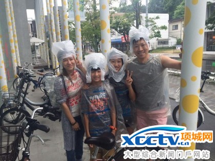 侯昌明一家四口今年去日本度假时,用垃圾袋克难当雨衣。资料照片