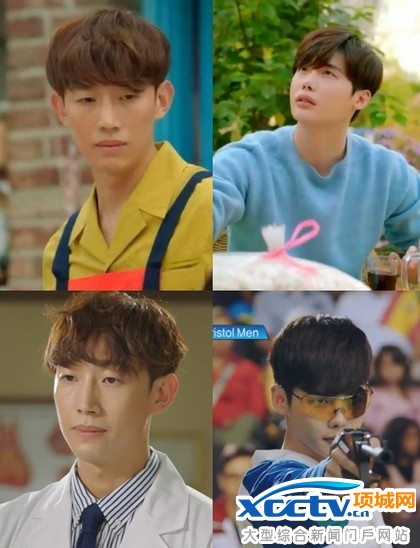 饰演剧中女主角叔叔的姜其永(左上),在《W》饰演韩孝珠好友(左下);李锺硕义气出演《举重》(右上),在《W》他则是漫画主角姜哲(右下)。合成照片,翻摄MBC