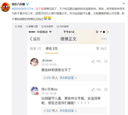 蔡依林(Jolin)入行后的3段情,「首部曲」双J恋对象周杰伦(Jay)是乐坛才子,彭于晏是华语影坛一线小生,混血帅哥锦荣为模特儿出身。她与彭恋情的曝光度,较不如其他2位,粉丝好奇下,彭于晏昨天立即登上微博的热搜榜,不少人喊着要他追回蔡依林。《壹週刊》报导,「彭蔡恋」外传是李威牵线,曝光始于2007年1月,网友在英国伦敦大街目击Jolin和彭于晏约会,上前询问时她否认是本尊,不过当时她的确在该地游学;3月蔡依林夜访彭于晏住处,待4个小时之后离开。2006年中旬2人交往,但遭彭于晏的公司百般阻扰,外传彭母也不喜欢形象太性感的蔡依林,2人维持一致态度,从头否认到底;这段3年地下情是在蔡爸2011年不慎口误才曝光。《网易娱乐》报导,蔡依林与交往6年的锦荣分手后,许多人希望他们复合,2人当年这段感情及分开原因也在网路疯传,因此火速登上微博热搜榜第1名。也有不少粉丝留言「别扯彭于晏了,放过他吧」、「如今都过得好,往事别再提了吧」。《网易》新闻报导,彭于晏严守公司不准恋爱、不准出入夜店等规定近7年后,2008年开始和公司唱起了反调,与蔡依林的恋情被迫熄火后,彭于晏与公司决裂,无意与公司续约,演齣戏剧也不愿配合,第一男主角的戏份也遭删除。半年停工让彭于晏损失惨重,演艺事业差点毁于一旦。直到2010年签了新东家,彭于晏确定了戏路,拼命证明自己的动力某种程度也是源自与蔡依林分手,或许只有把自己变得更强大,才有资格去争取想要的东西