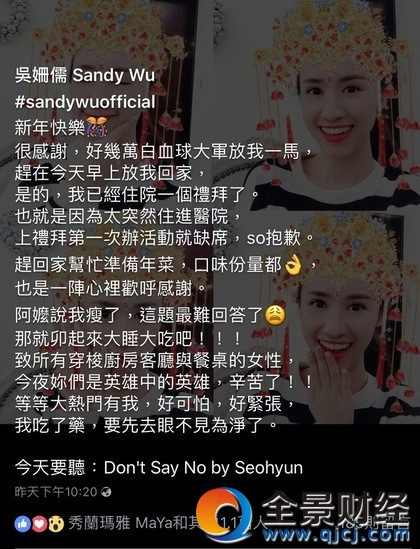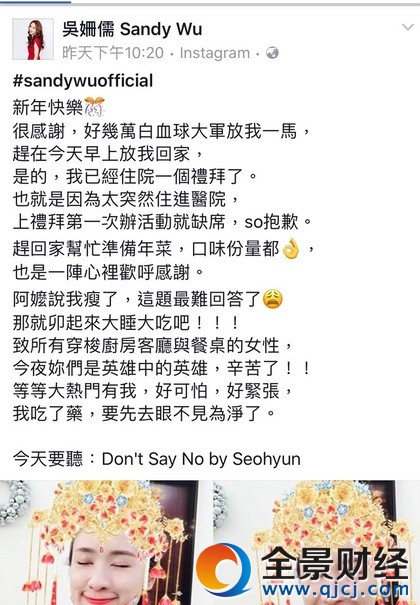 Sandy(吴姗儒)除夕夜在脸书PO文,表示上礼拜住院住了一星期,因为白血球过高,让粉丝为她担心。翻摄吴姗儒脸书