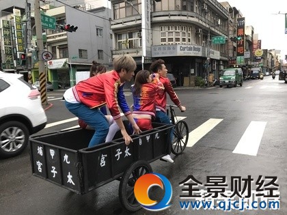 王建复骑三轮车带队友在街上狂奔。民视提供