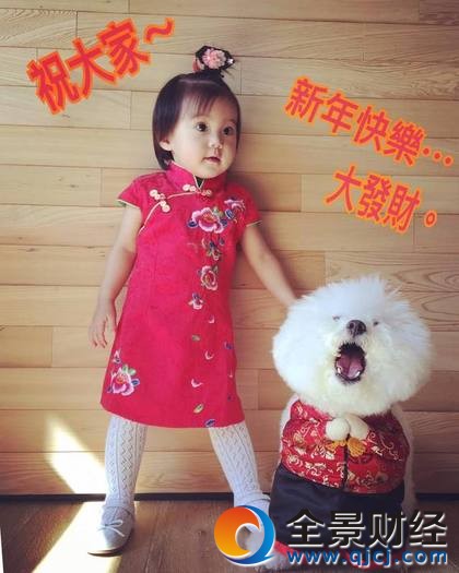 咘咘(左)化身小格格与家中爱犬齐力拜年。翻摄贾静雯脸书