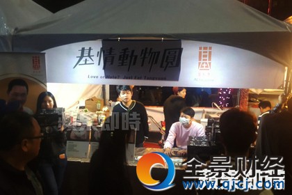 阿基师今下午再度现身摊位,他和插画家厌世姬(右)合力叫卖「基情动物圆」汤圆礼盒。特勤组摄