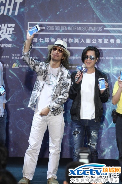典礼製作人董事长乐团的阿吉(右)与歌手猪头皮展示这次金音奖的手机App。张桓诚摄