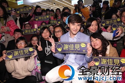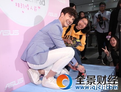 谢佳见帮粉丝绑鞋带。陈明中摄