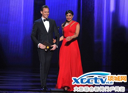 汤姆希德斯顿(左)与印度女星琵安卡查普拉携手颁奖