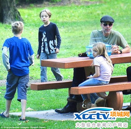 裘莉的哥哥詹姆斯(右上)周日带夏萝(左起)和诺克斯、薇薇安三姊弟到洛杉矶公园玩耍。翻摄英国《每日邮报》