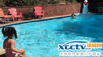 王力宏(右)推着天鹅造型的泳圈,逗坐在泳池边的女儿开心。翻摄王力宏微博