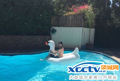 王力宏童心未泯,骑在天鹅造型的泳圈上玩得很开心。翻摄王力宏微博