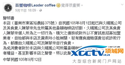 首玺咖啡脸书声明。翻摄首玺咖啡脸书