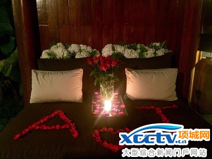 单身趴以玫瑰花卉布置,还用花瓣排出新人的英文名字字首A&T。明悦提供
