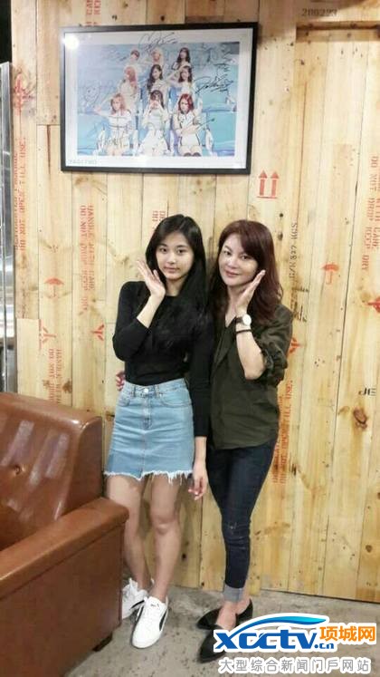 近乎素颜的周子瑜(左)与妈妈在店内「TWICE」海报墙前合影。翻摄周子瑜 Tzuyu ??脸书
