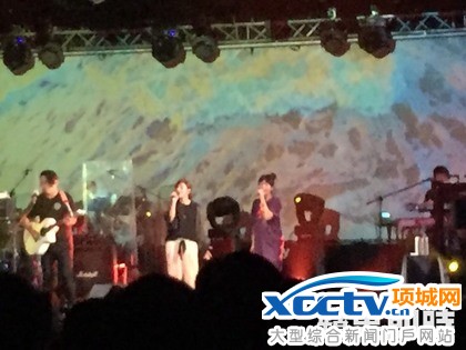 苏慧伦和何欣穗在台上合唱《我们快乐地向前走》。读者提供