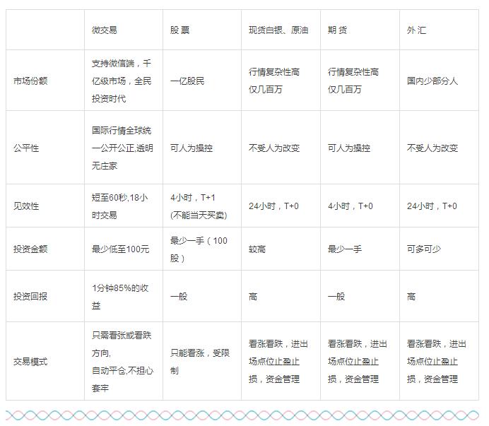 微交易作为一种新型的投资交易方式近年来收到越来越多投资者的青睐,很多之前炒股票、期货的朋友都开始关注着微交易,微交易的交易量迅猛发展,究竟它有什么魅力呢?微交易跟股市相比优势又在哪里?今天就简单的跟大家分享跟股市相对比,微交易的优势在哪!?