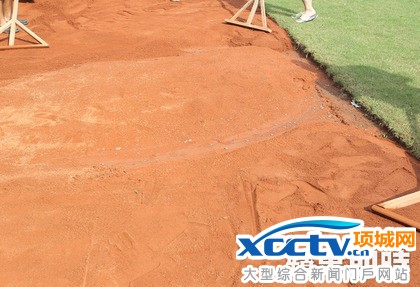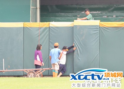 工作人员紧急修复全垒打墙。陈俊杰摄