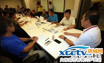 郭泰源总教练(左二)向媒体说明会议结果。李鸿明摄