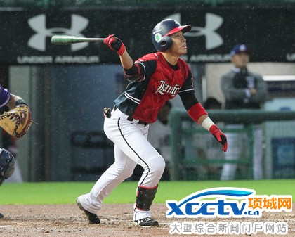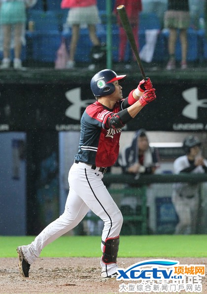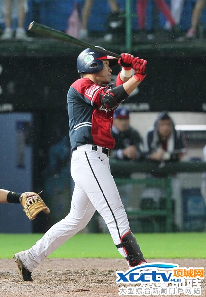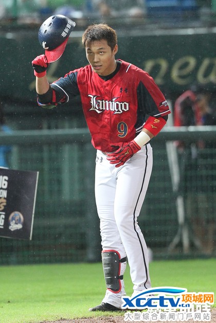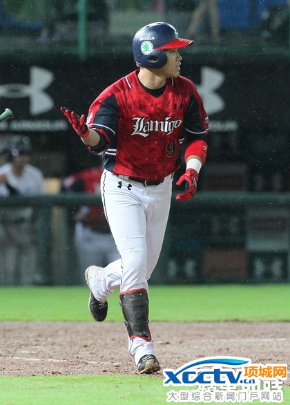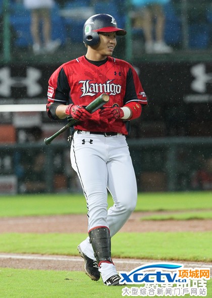 王柏融遭触身球,表情无奈上一垒。游智胜摄