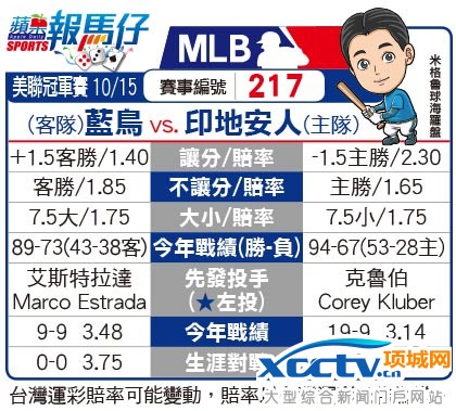 大联盟美联冠军系列赛,台湾时间明(15)日开打,首战由克里夫兰印地安人在主场迎战多伦多蓝鸟。印地安人推出赛扬强投克鲁伯(Corey Kluber)先发,蓝鸟的先发投手则是艾斯特拉达(Marco Estrada)。洛老师运动网分析师米格鲁球海罗盘认为,两队先发投手状况都很好,但蓝鸟在前面系列赛对游骑兵火力发挥比印地安人好,因此推荐蓝鸟过盘。以下是米格鲁球海罗盘的分析:美联冠军战首场赛事蓝鸟派出的先发投手艾斯特拉达,前一战8.1局只有失掉4分状况非常好,然而印地安人派出的先发克鲁伯前一战同样是7局0失分的好投,双方投手都是近况极佳。不过就打击面来看,蓝鸟在前1个系列赛面对游骑兵3场就狂打22分,印地安人面对红袜只打15分,蓝鸟显然打击发挥的比印地安人更强势。运彩盘路来看,两队例行赛交手虽然印地安人取得4胜3败,但是对战让分盘却是蓝鸟取得5胜2败的压倒性优势,本战推蓝鸟过盘。