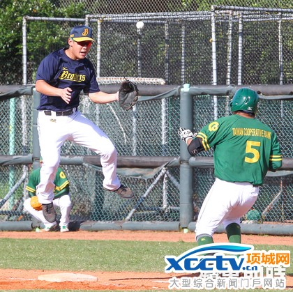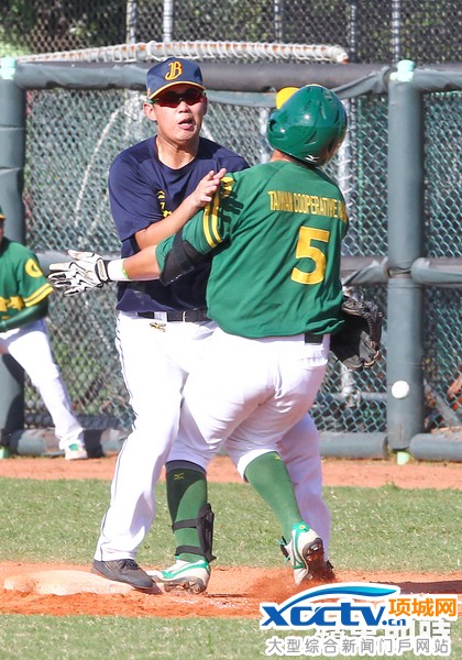 中信兄弟潘萣翔在一垒与合库球员相撞。赵文彬摄
