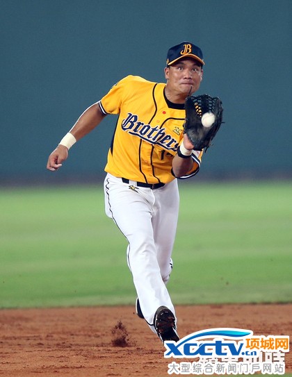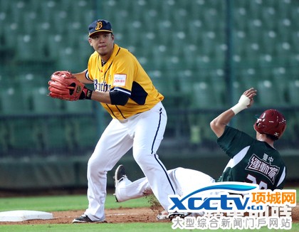 蒋智贤先将冲向三垒的跑者封杀后,準备将球回传。李鸿明摄