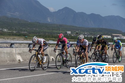 在美利达蓝波车队冯俊凯(左2)带领下,在绕圈赛段即形成一个7人领先集团。中华民国自由车协会提供