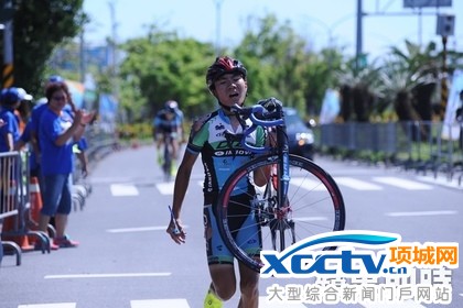 王一欣立即效法环法冠军车手弗洛姆扛车进终点。中华民国自由车协会提供