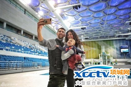 菲尔普斯带妻小重返水立方。翻摄网路