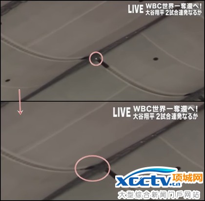 上图中球还看得到,但在下图中,球就钻进东京巨蛋屋顶的缝细中。截自youtube