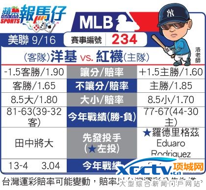 美国大联盟明天(16日)共有10场例行赛,台湾运彩开放美联东区世仇对决洋基@红袜单场投注,洛老师运动网分析师洛老师推荐红袜PK过盘,以下是他的分析:年轻的罗德里格兹虽然帐面成绩不是很出色,不过他却有个球队最爱的特性,对洋基怎幺投怎幺顺!4胜1败、防御率1.88,5次先发全优质,不知哪里去找另一个这幺好的洋基杀手。虽然说洋基这边派出王牌田中把关,不过红袜是这个分区当中他投最差的一支球队,在芬威球场很难立保不失分,且洋基的牛棚和红袜还是有些差距的。这战实在不看好邪恶帝国能踢馆成功,推荐红袜PK。