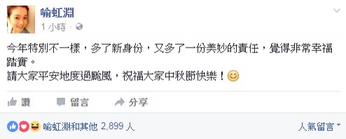 喻虹渊今天下午在脸书PO文,「今年特别不一样,多了新身份,又多了一份美妙的责任,觉得非常幸福踏实」,并在文末提醒大家颱风天注意安全,并祝中秋节快乐。事实上,喻虹渊和仔仔从恋爱到结婚,直至生孩子,整个过程都非常低调,2人也鲜少在公开场合出现,就连合照也相当少见,这次她在脸书以简短的文字,描述了初为人母的喜悦和幸福的婚姻生活,让不少粉丝看了兴奋留言:「可爱新手帅爸靓妈妈小公主中秋节快乐」、「沉溺在当妈妈的喜悦中,中秋节快乐!」、「周太太!要幸福哦」。